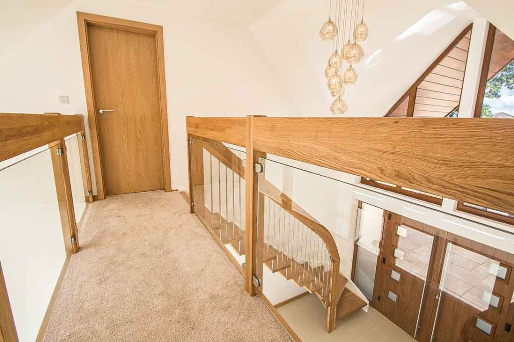 Oak treads and handrail, finished in matt lacquer to echo the oak framing throughout the property