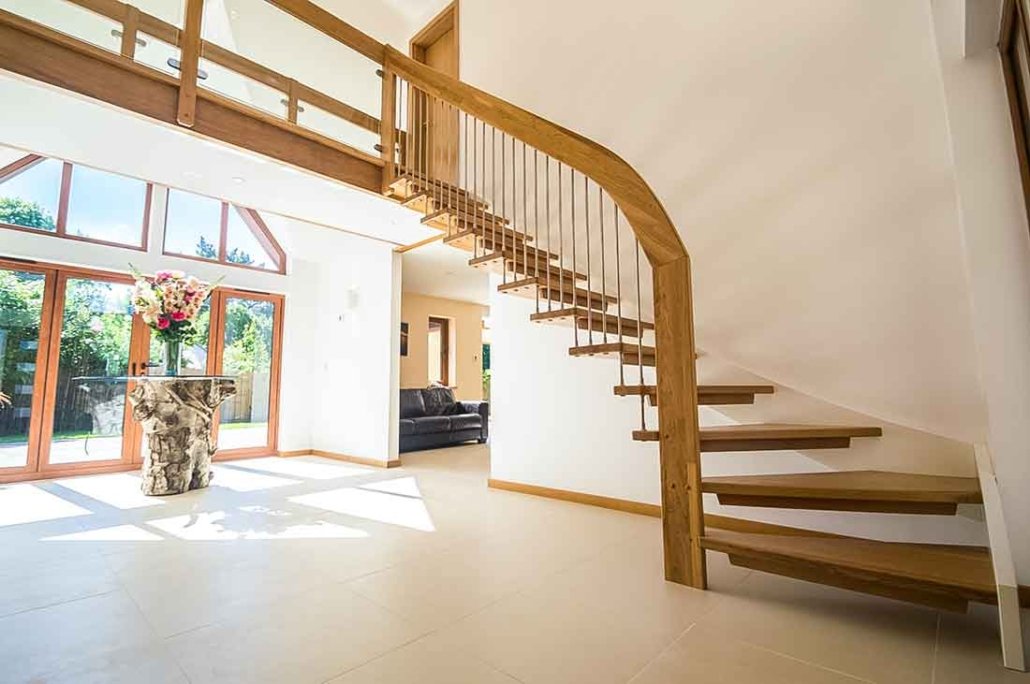 In Chilworth, Hampshire, we were approached by a previous client building a spacious open-plan home who wanted a staircase that emphasised light and openness while becoming a striking architectural feature. For this project we supplied a bespoke WF floating timber staircase, featuring a quarter-turn configuration that complements the generous hallway and invites natural light to flow through the space.