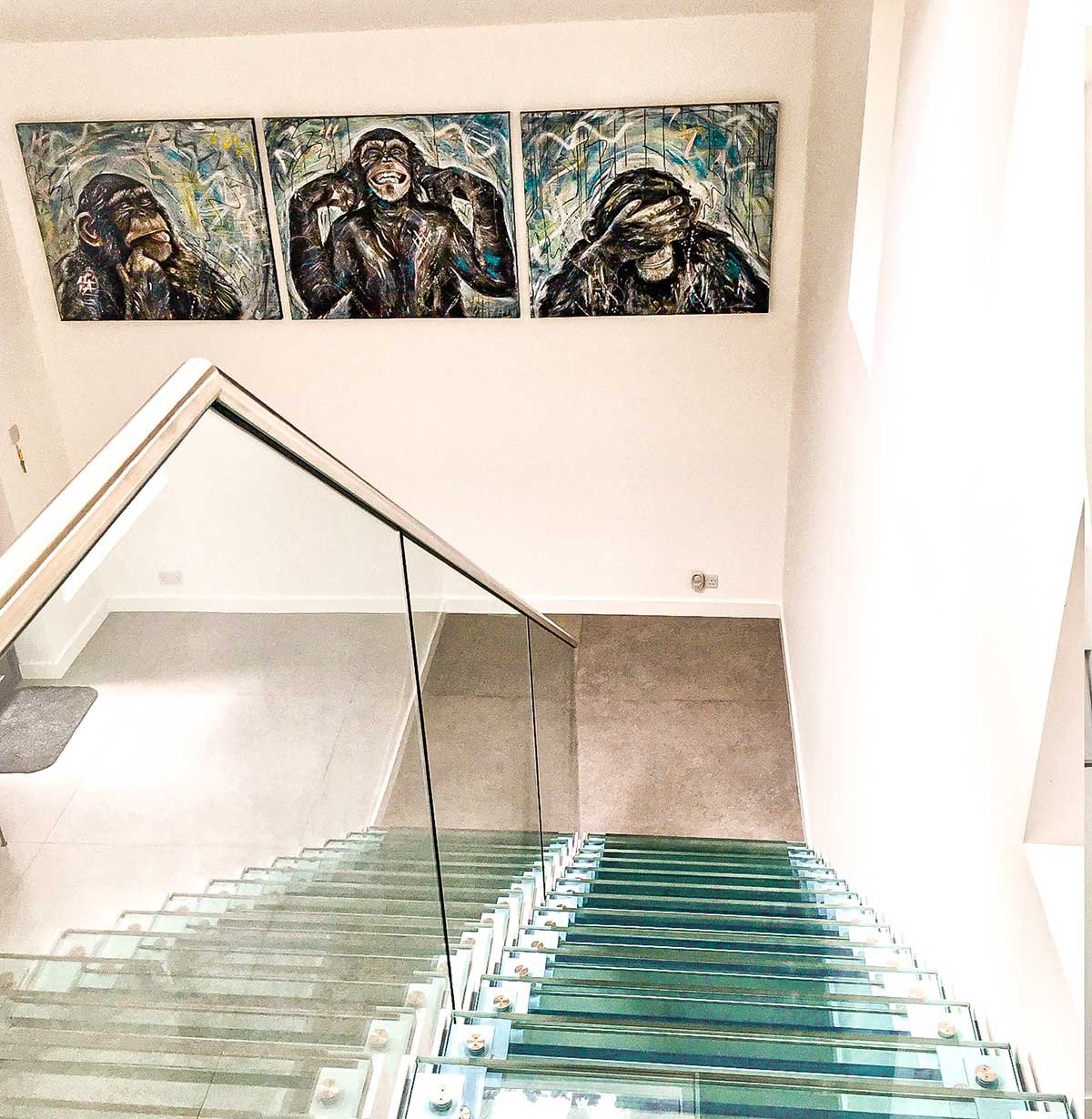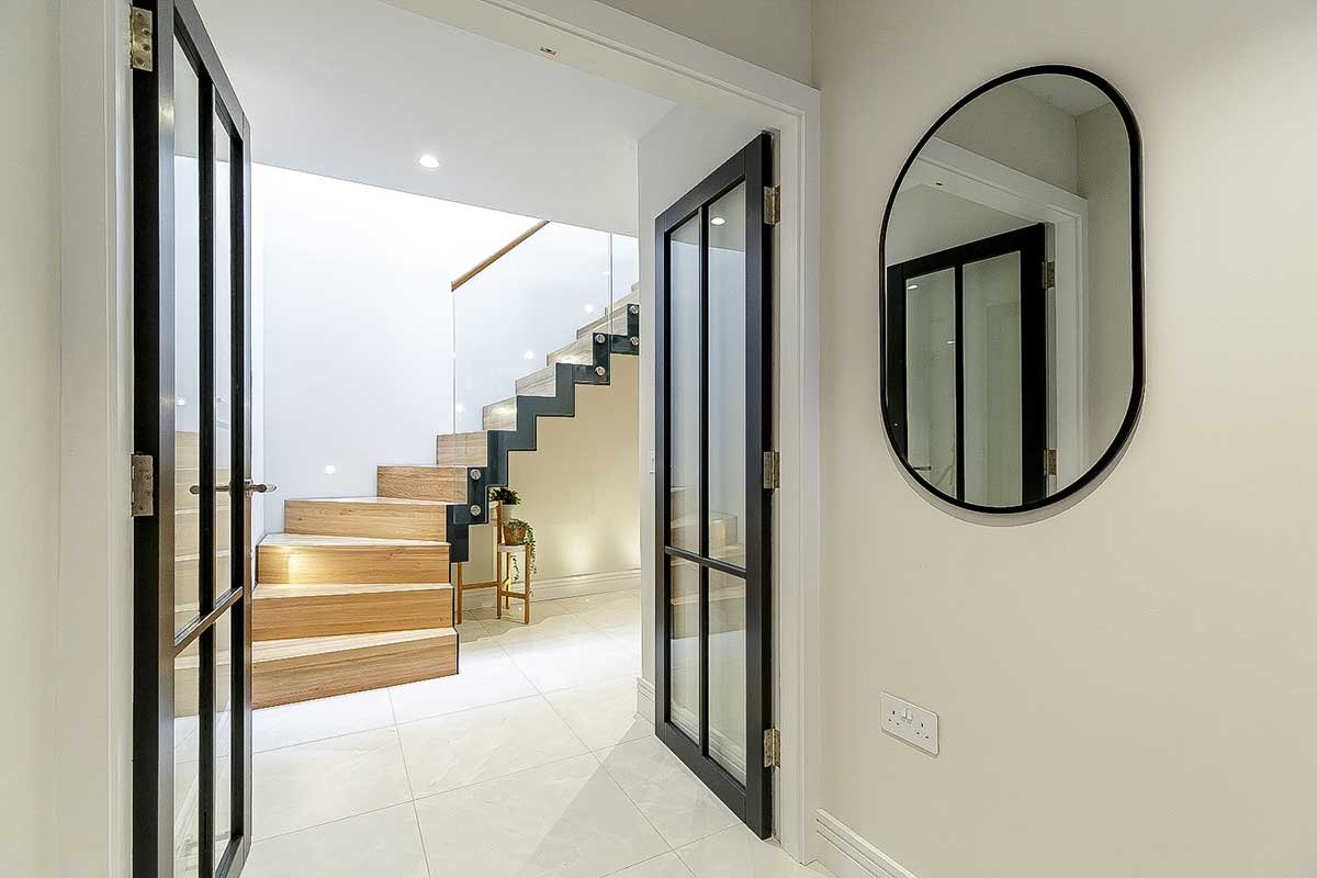 Steel stringers are powder coated in any RAL colour and support laminated toughened glass panels, making the staircase not only visually striking but also durable and safe for everyday use.