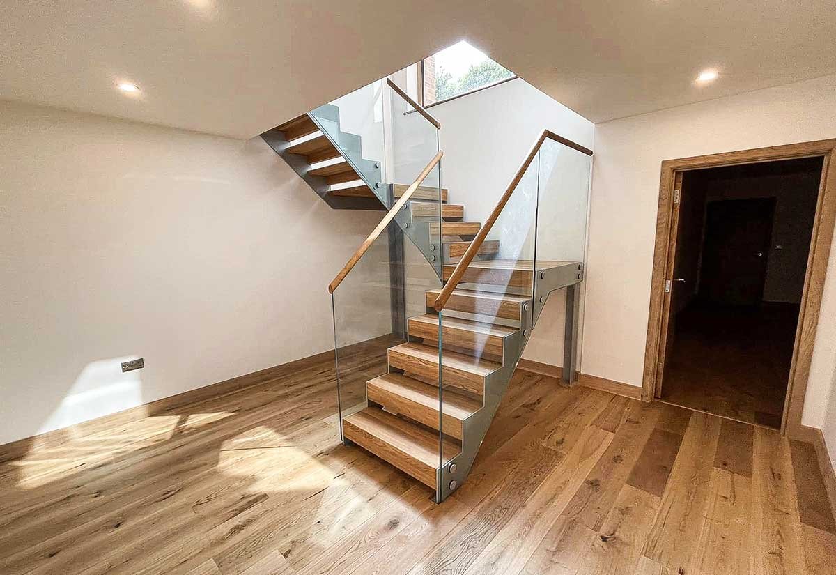 It combines solid timber treads with slim 10mm steel plate stringers positioned either side of the staircase, creating a clean, architectural appearance while maximising light and openness throughout the space.
