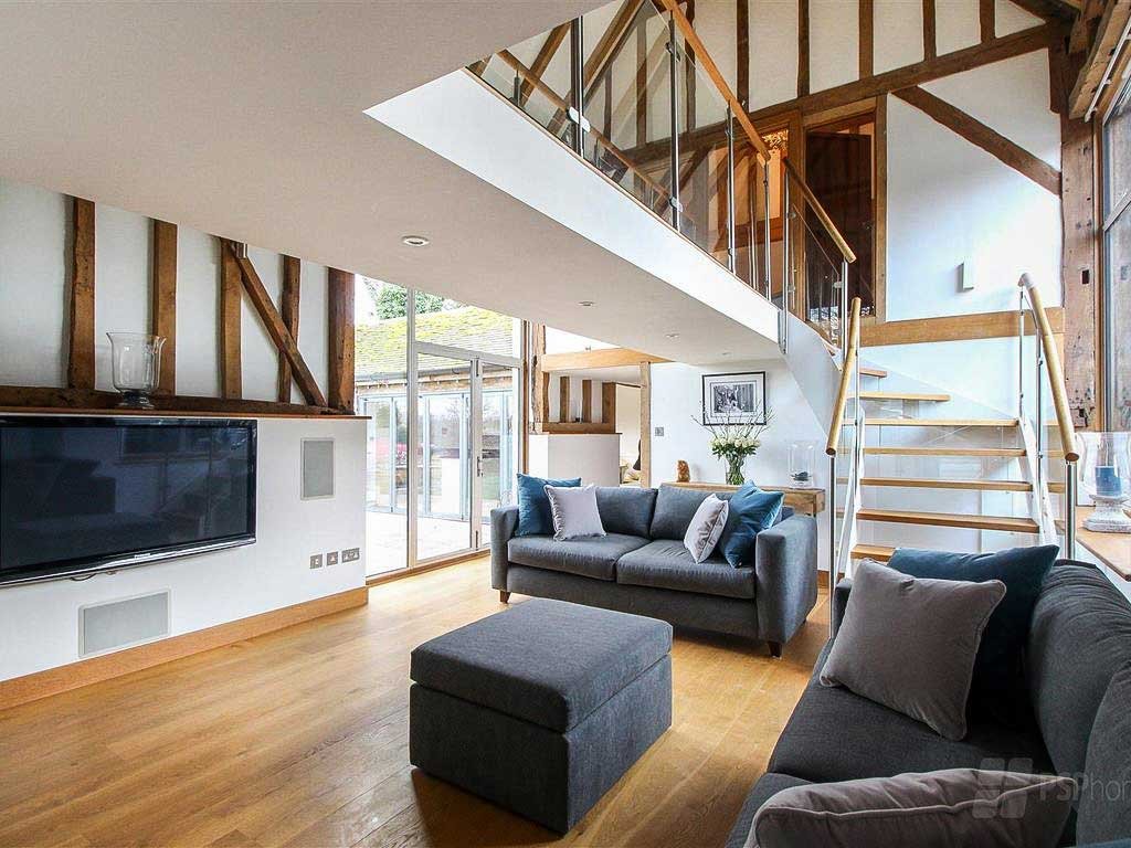 • bright steel spiral stair in a church conversion with chair and log burner