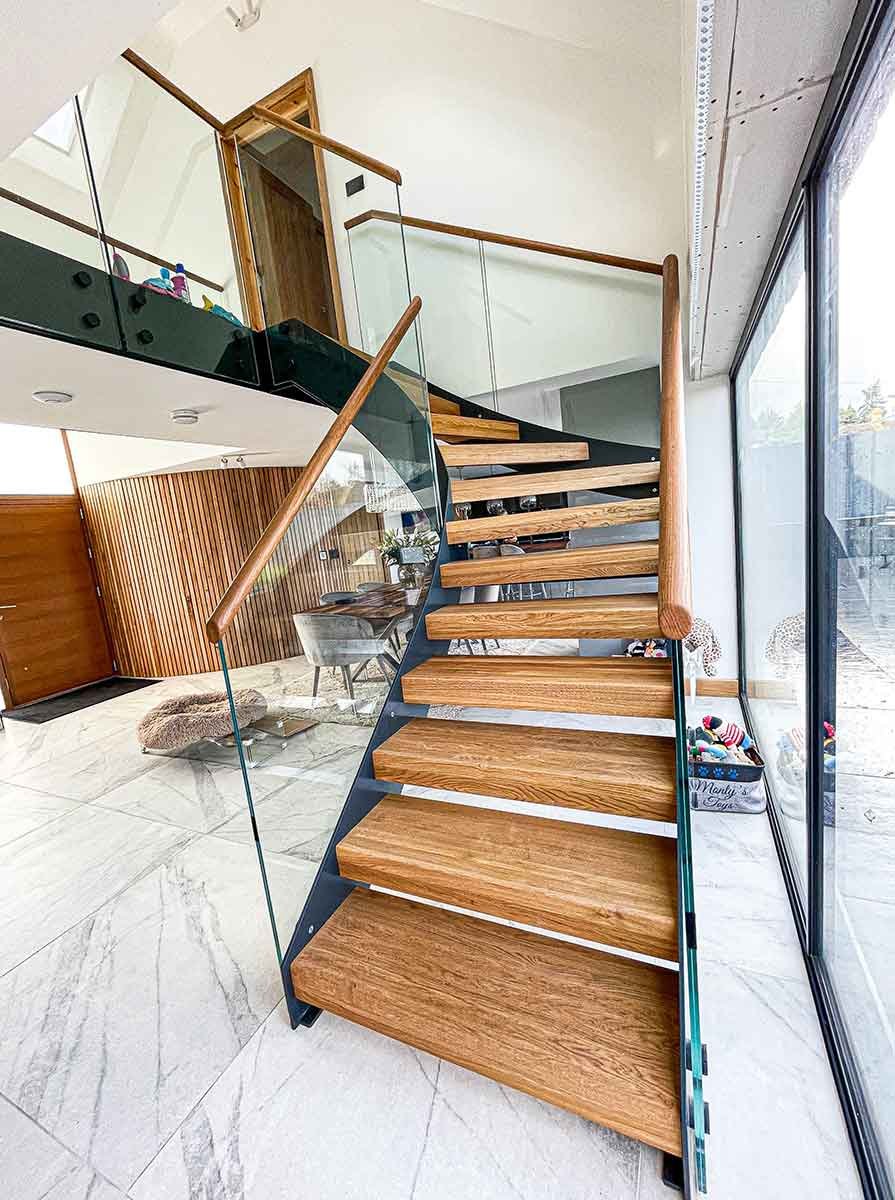 Model 500 modern staircase rising against a wall with tiled floor in front