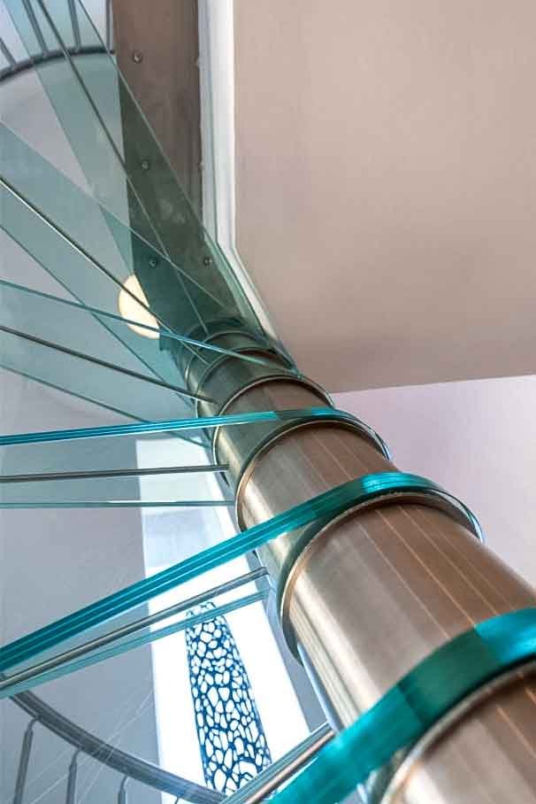 We designed our model 76 spiral staircase featuring laminated structural glass treads and a brushed stainless steel handrail, delivering a minimalist aesthetic.