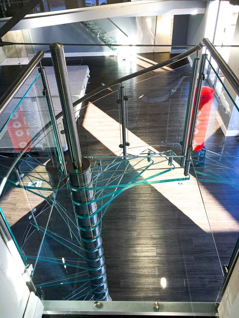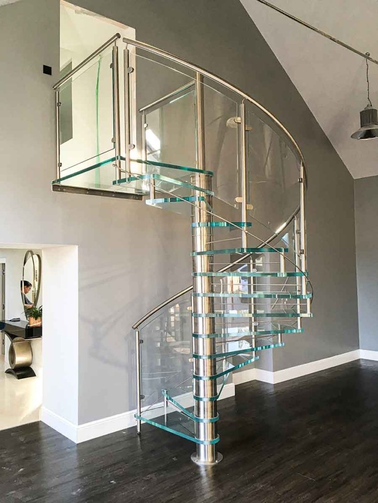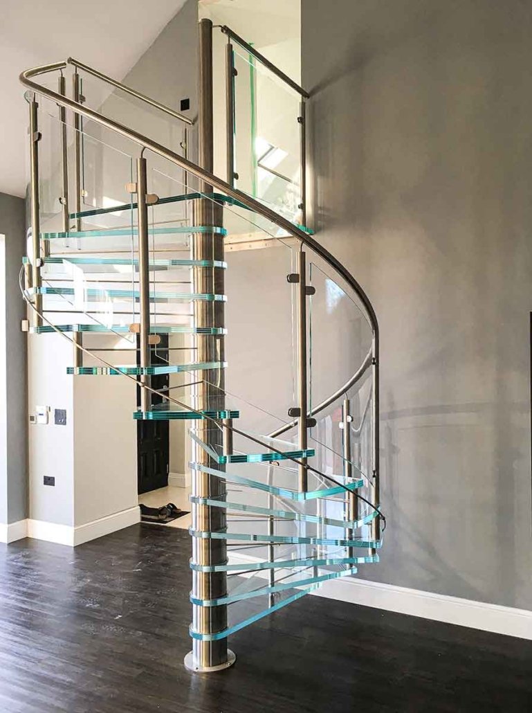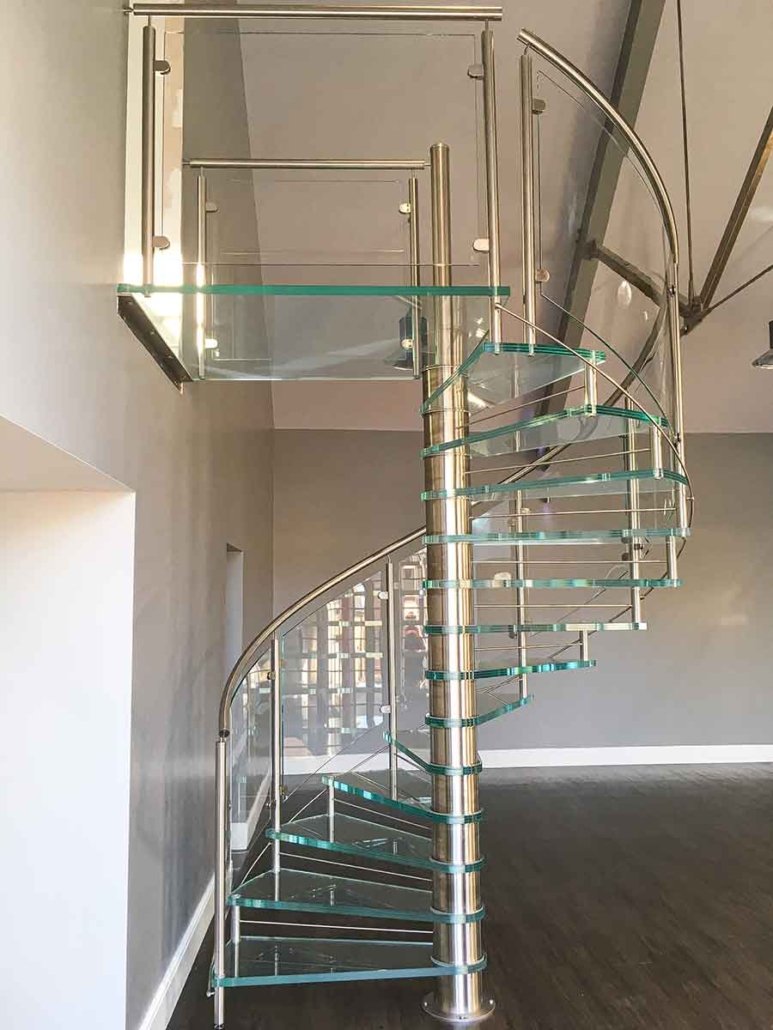 Our answer was to propose our Model 76 glass spiral staircase. The system provides the size and strength required to be specified as a main access stair whilst the glass treads and balustrade optimise the flow of light through the staircase. The toughened laminated treads also mean that the treads are strong enough to support the same use as a traditional residential staircase, allowing the customer to carry out tasks such as moving furniture up and down it. Whilst the impressive, curved glass balustrade adds style to the staircase, it’s specification as safety glass makes it every bit as safe as a traditional spindle balustrade.