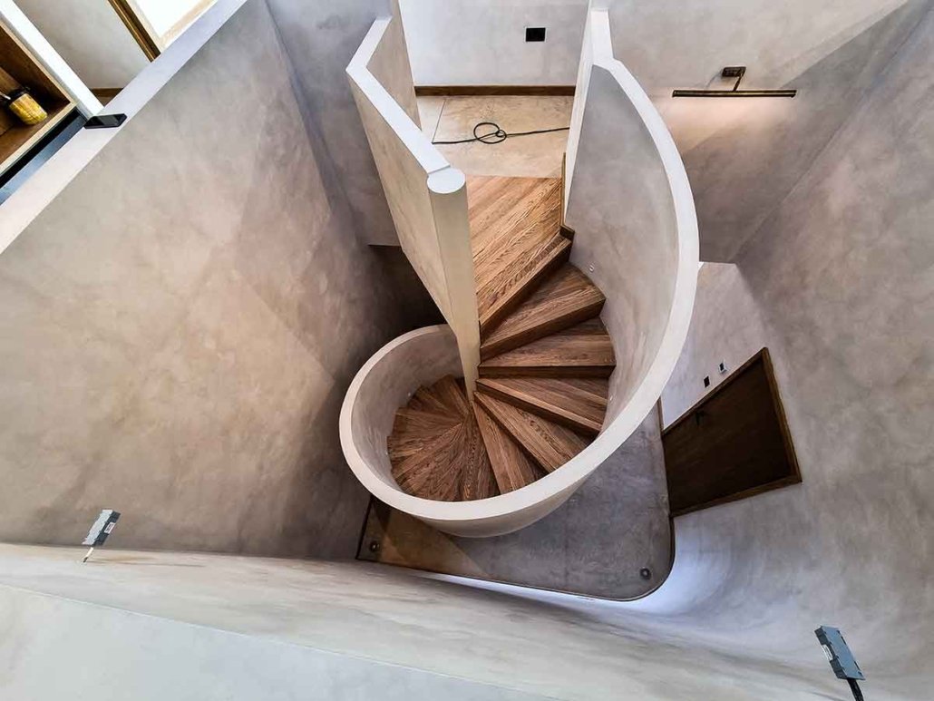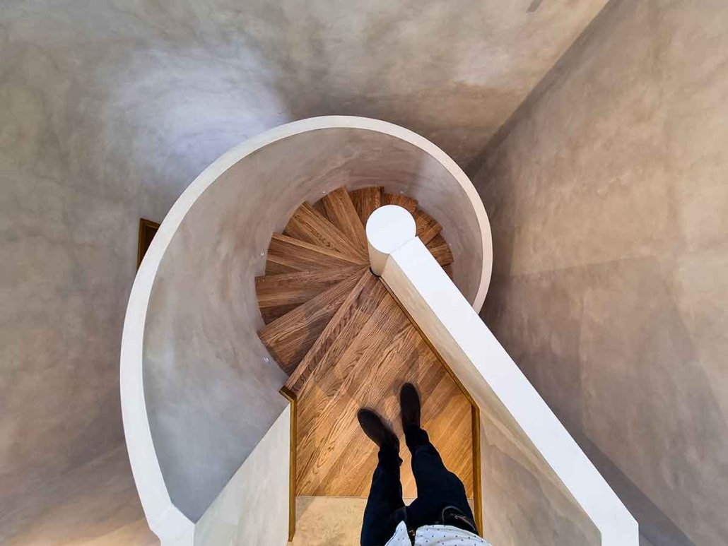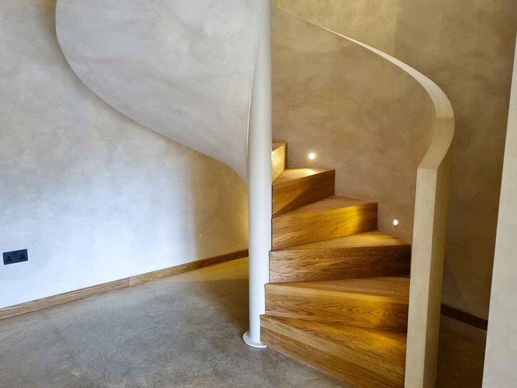 The on-site carpenter then lined the balustrade with ply, battened the underside, and plastered it smooth. Along with the surrounding stairwell, the plaster was finished in a special lime paint, creating a distinctive mottled look.