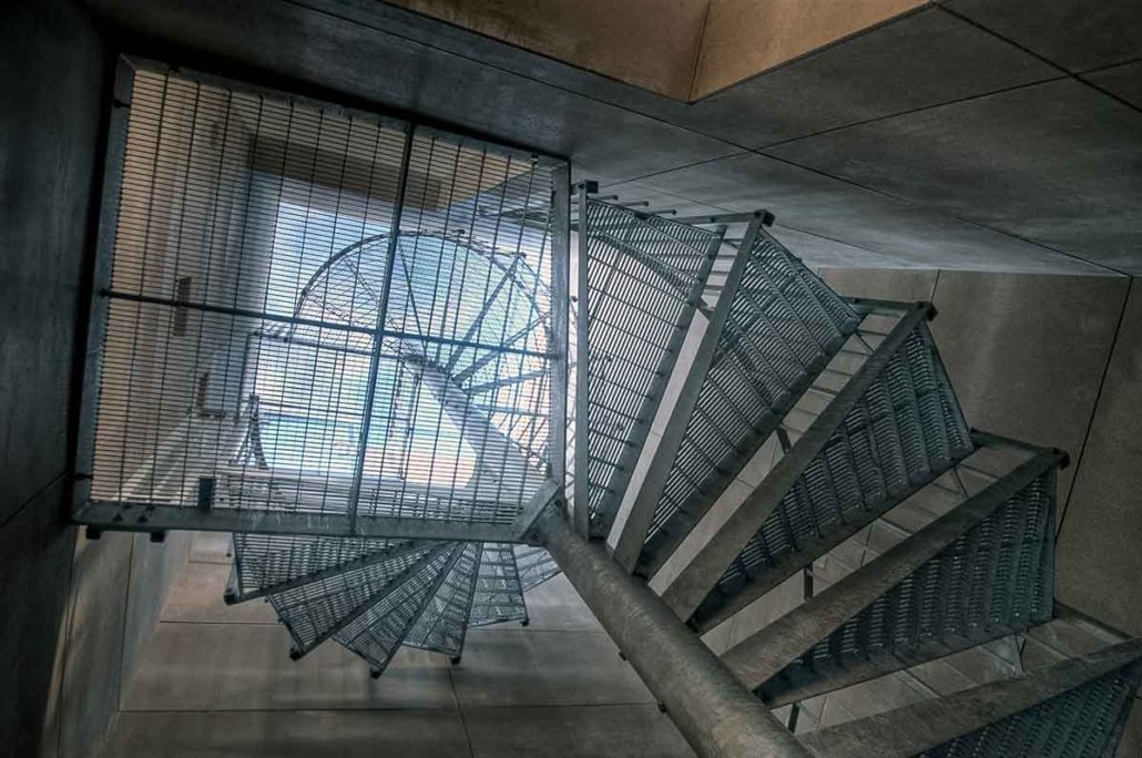 - A Double flight industrial looking spiral staircase