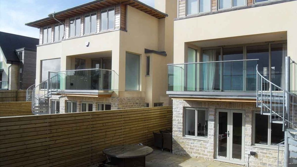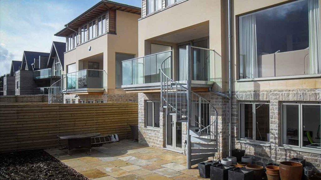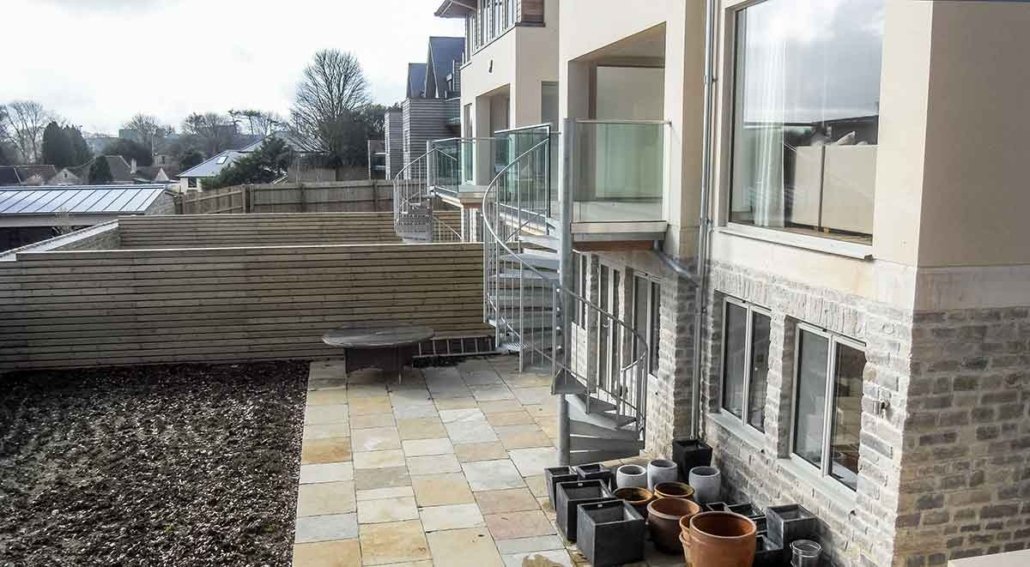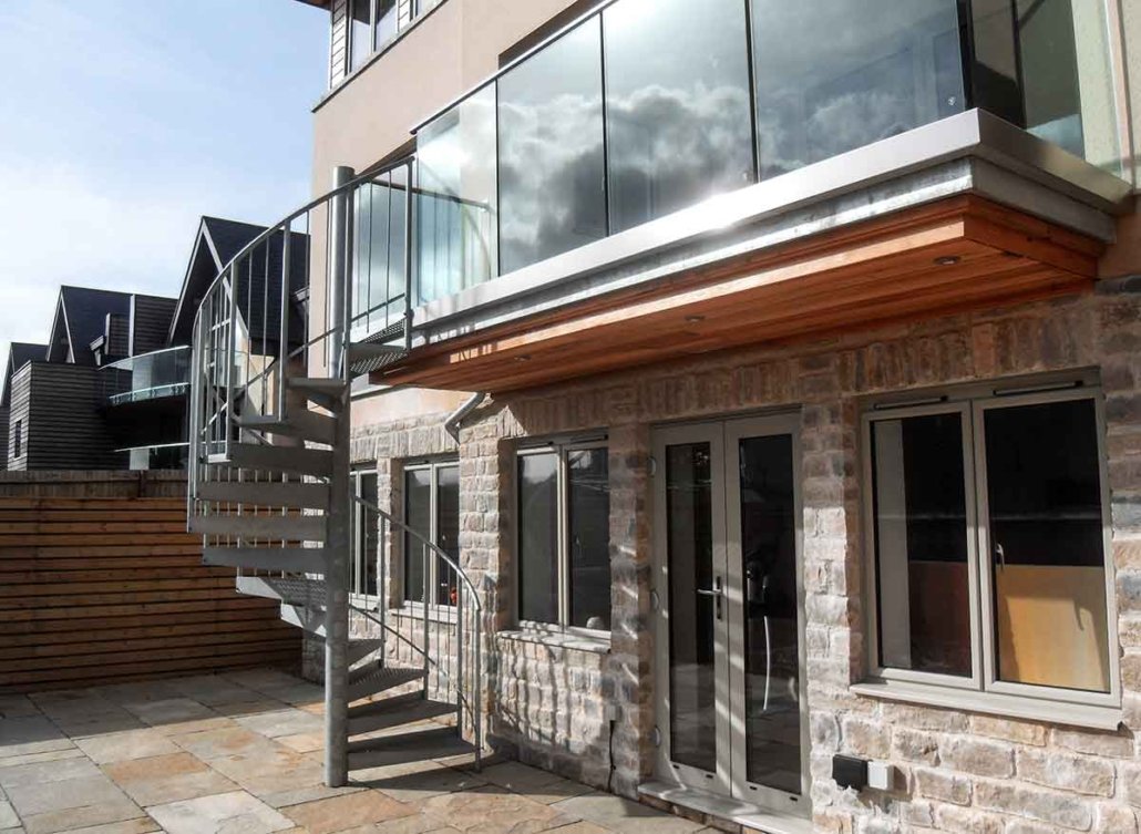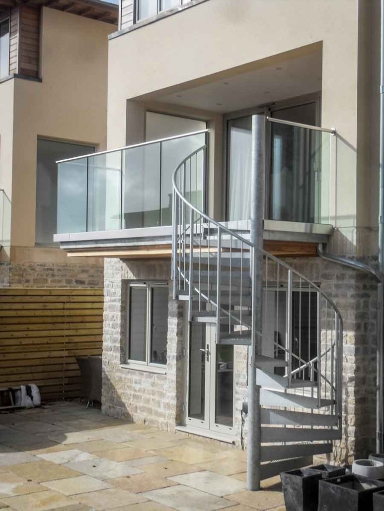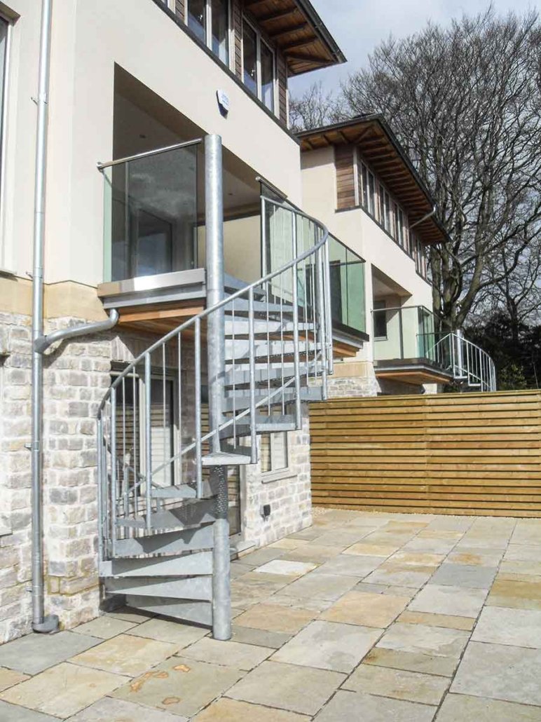 They needed a spiral staircase at the rear of each home to connect the balcony to the garden below, offering a space-efficient solution that also served as a sculptural feature.