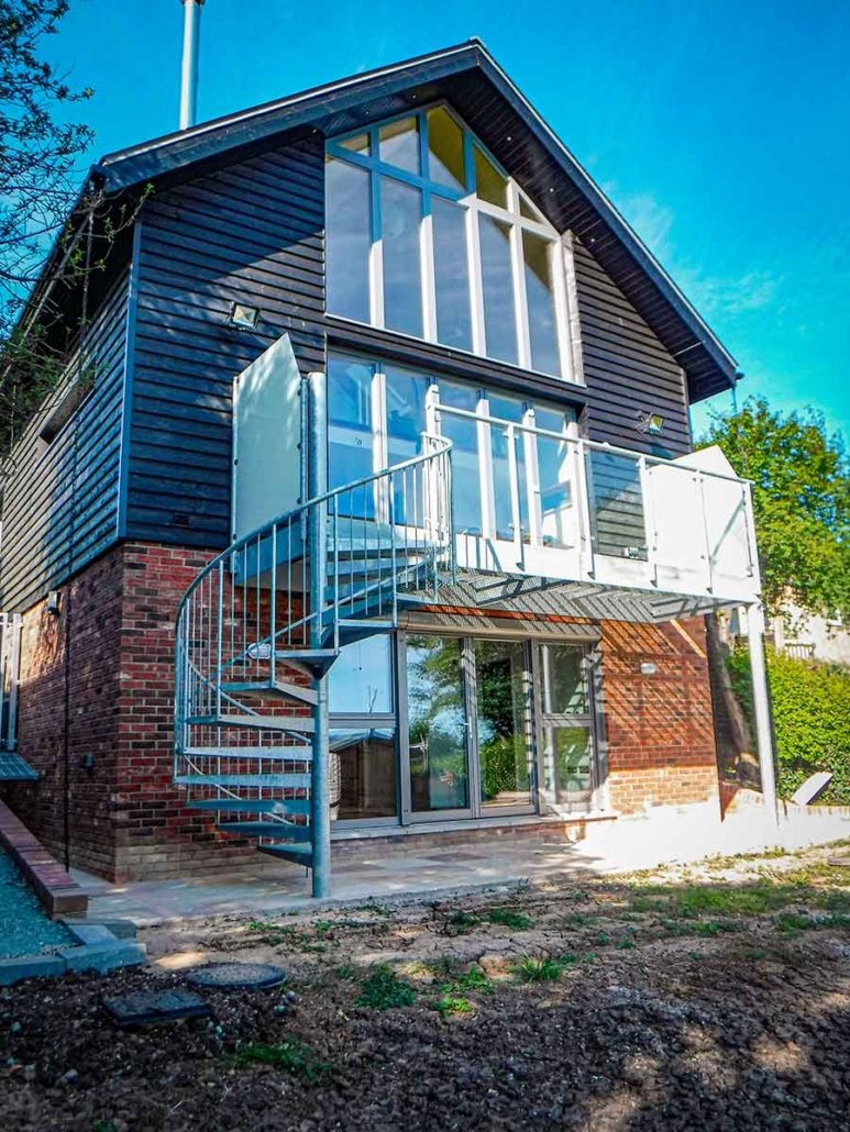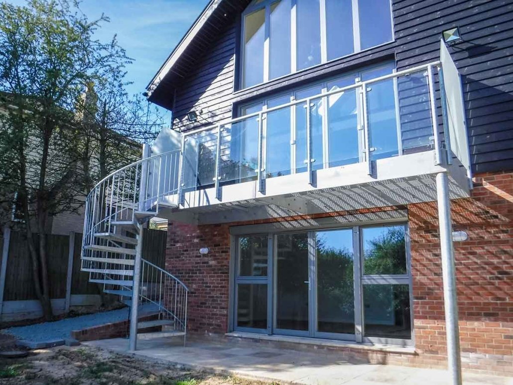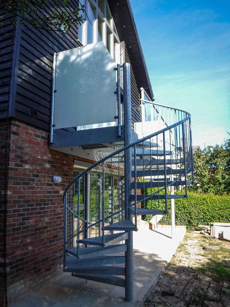 Our client built a new property in Maldon, Essex, backing onto the River Chelmer estuary with stunning views over a nature reserve. They wanted not only a quick and easy route to the garden but also a raised balcony area to relax and enjoy the scenery. A spiral staircase was the obvious choice, with its minimal footprint preserving space in the garden below. The 6m balcony ran along the building and was supported at the outer corners by a post and the central column of the spiral stair.