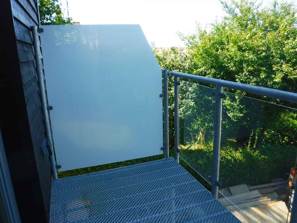 To keep the design light and open, the balcony featured steel newels and a handrail with toughened glass infill panels for maximum transparency. On either side, sections of 1800mm frosted glass panels provided privacy screens.
