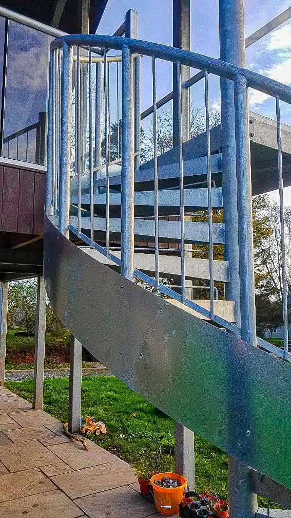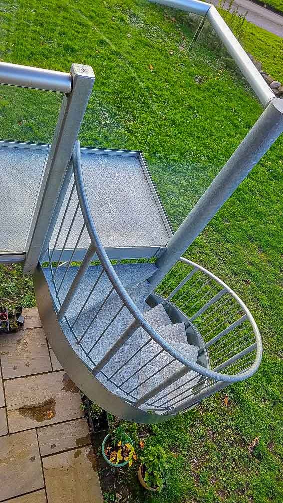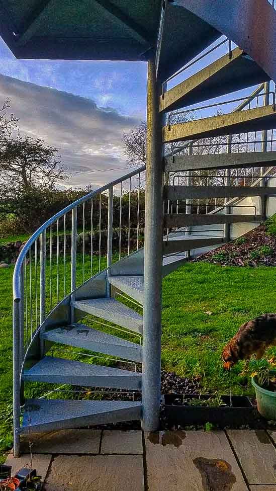 A spiral staircase was called for with its minimal footprint and its sculptural qualities. This was supplied in steel with a galvanised finish to ensure it could withstand the battering from the North Sea. To add a nice swoop to the stair and to soften its appearance a thin external fascia piece was added to the outer side of the stair.