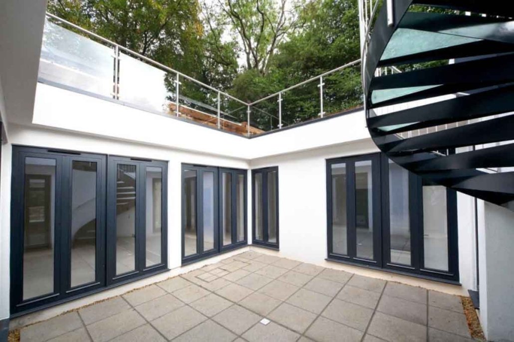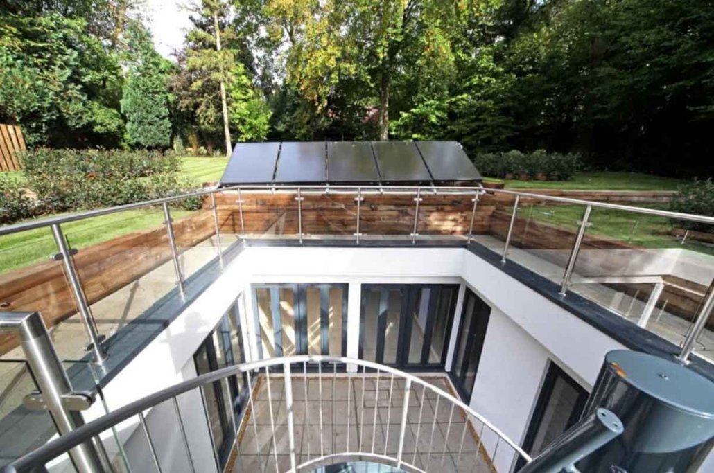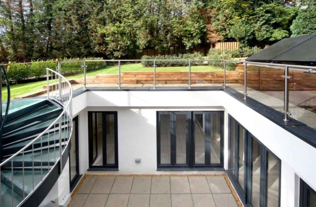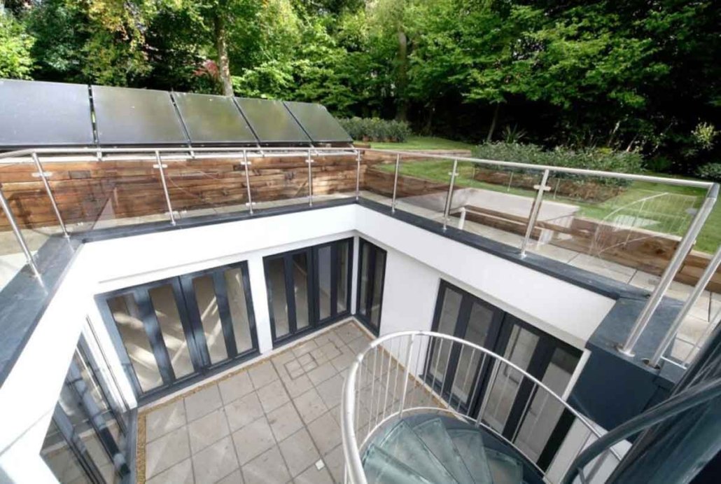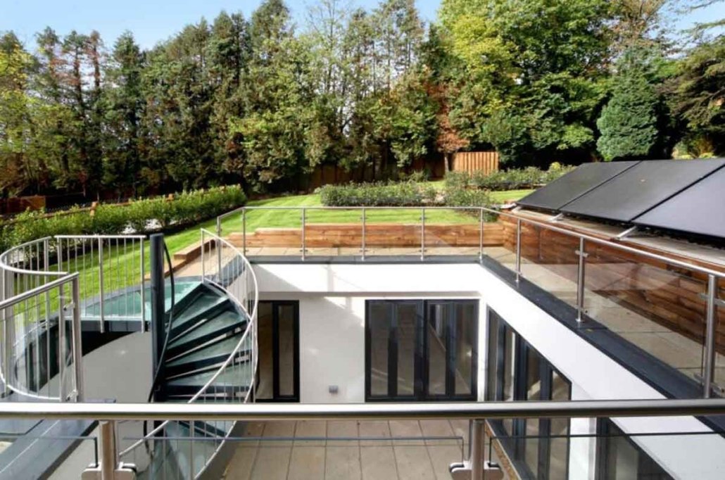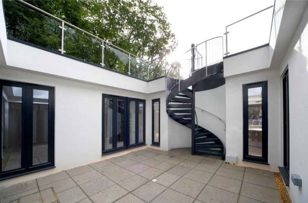 This spiral staircase was supplied to a customer building a subterranean house in Loudwater, Rickmansworth. The property was build around a central square void which housed our external spiral staircase. The roof of the property was effectively their garden with grass and vegetation leading to woodland on three sides.