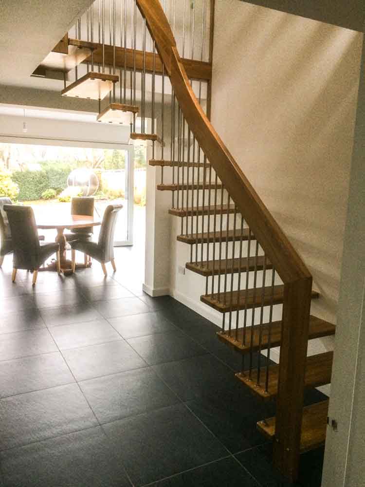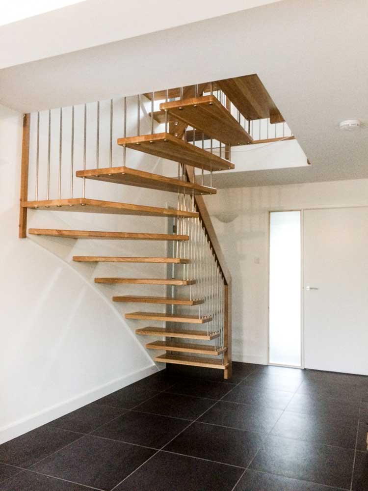 The WF staircase is a popular, more cost-effective alternative to a true cantilevered staircase. It does not require a solid block wall or embedded steelwork and can be installed adjacent to a timber stud wall.