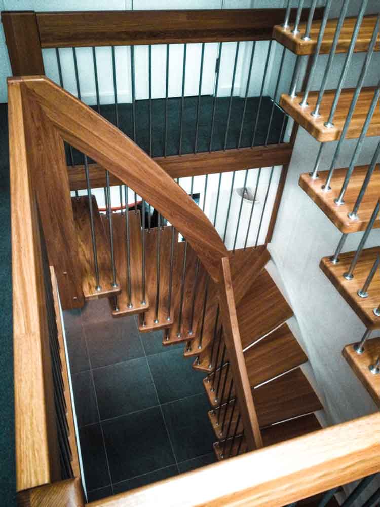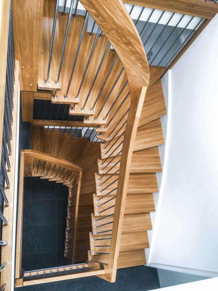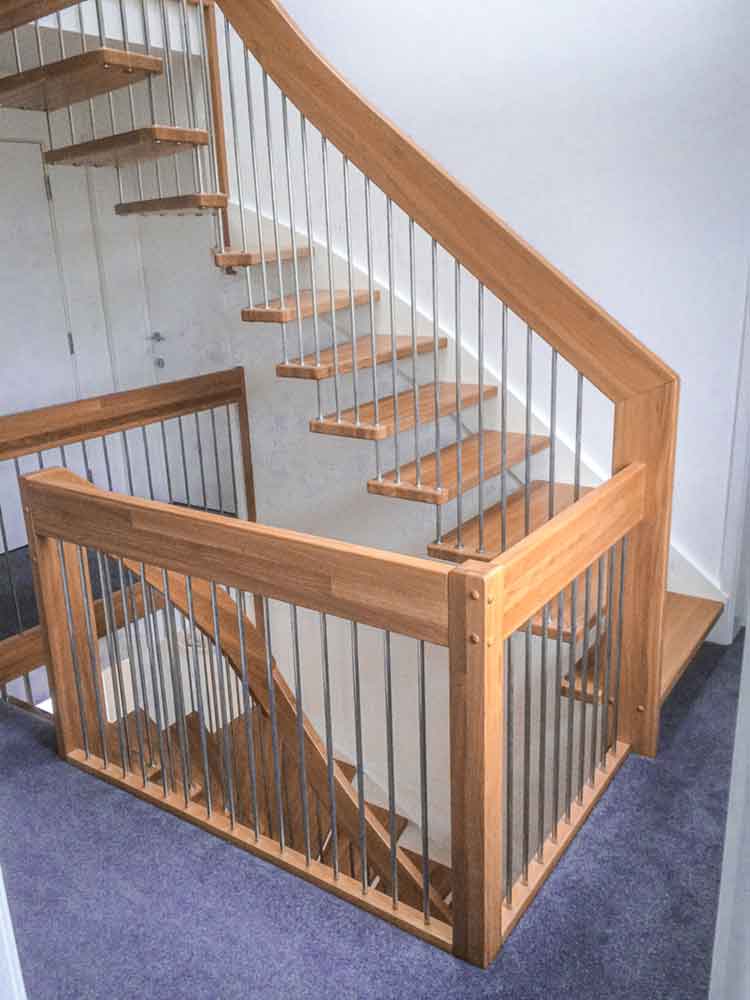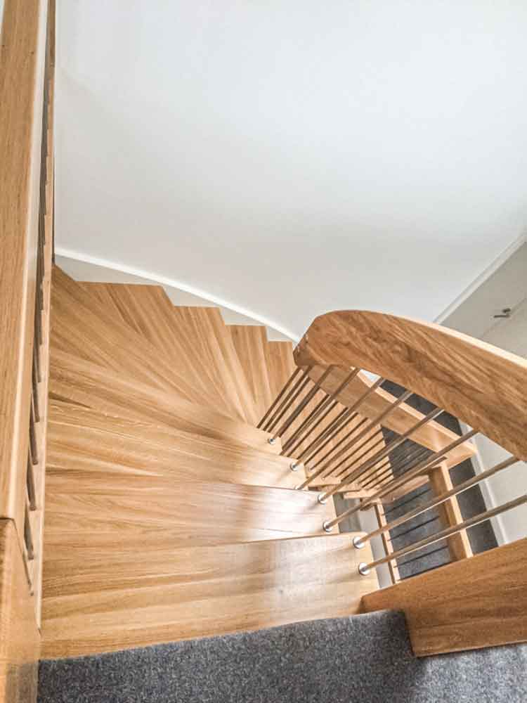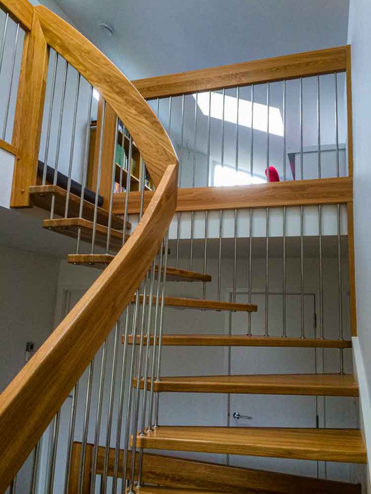 Oak was selected for the steps and handrail, with the wall stringer painted white to blend seamlessly with the wall. Brushed stainless steel spindles extended from the steps to the handrail, continuing around the openings on the first and second floors.
